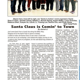 “We named this program ‘Santa in Action,’” explained Natalie Li, L.O.V.E. founder, describing this second annual Christmas season event. “Livingston is a diverse community that includes people from different countries and cultures. We came from China. In our tradition we don’t celebrate Christmas, but we do have in common the qualities of caring, loving and sharing, which are at the spiritual root of this holiday season in America whether you are celebrating Christmas, Hanukkah, Kwanza, or the Winter Solstice.”
